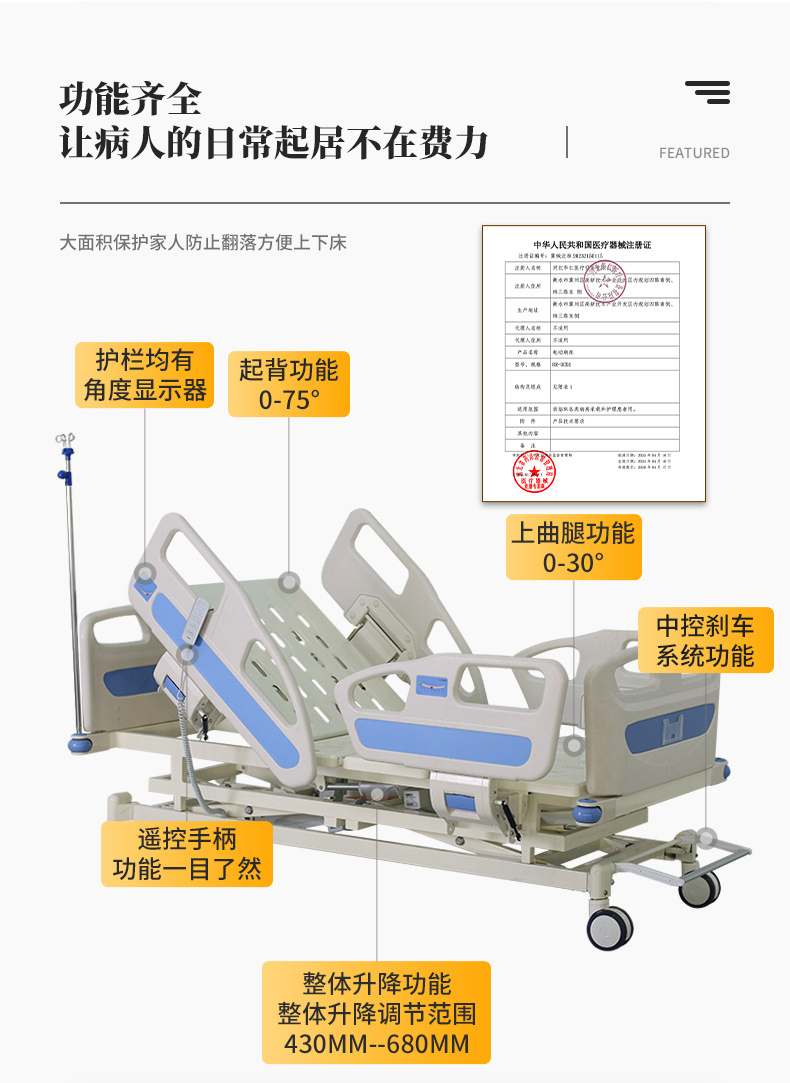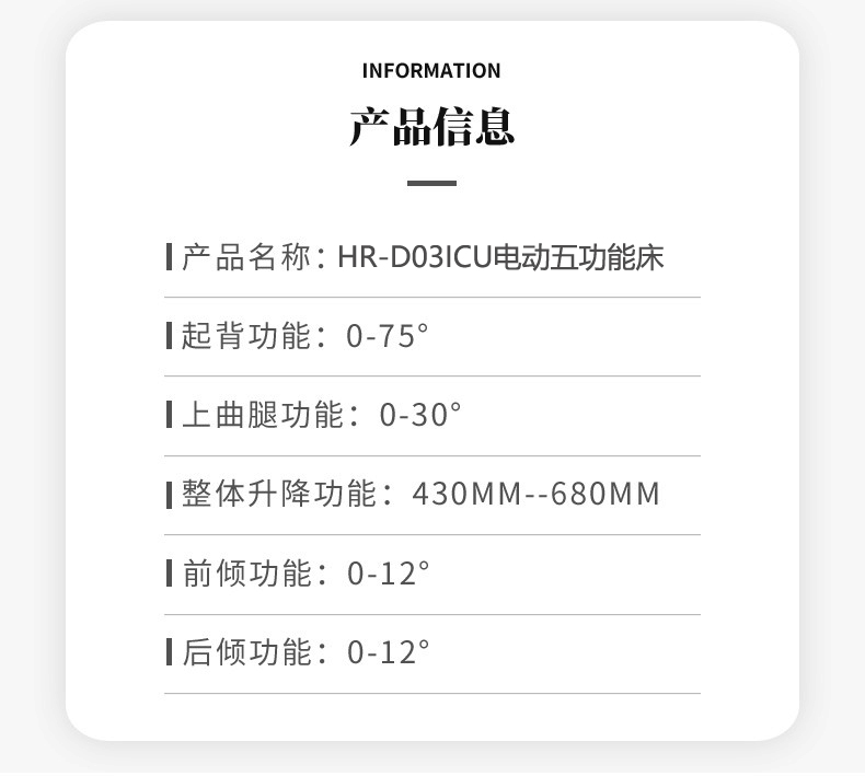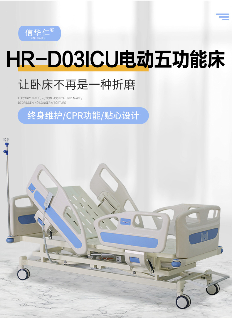 產(chǎn)品中心 > 醫(yī)用手動病床系列 > HR-D03ICU電動五功能床